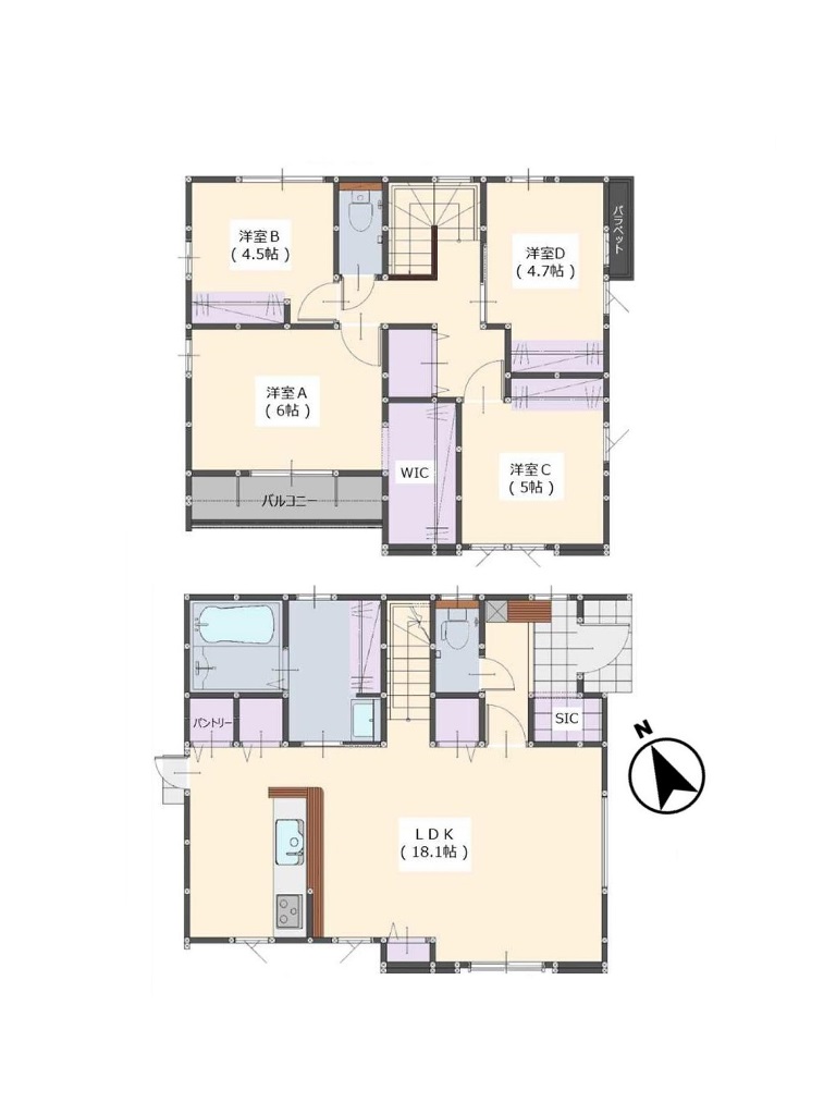 | 間取内容 | LDK 18.1畳 洋室 6畳 洋室 5畳 洋室 4.7畳 洋室 4.5畳 +WIC+パントリー | ||