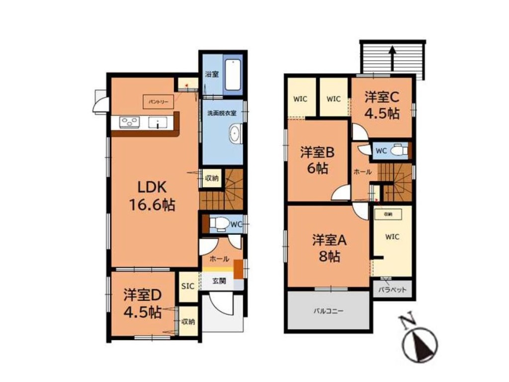 | 間取内容 | LDK 16.6畳 洋室 4.5畳 洋室 8畳 洋室 6畳 洋室 4.5畳 +WIC+WIC+WIC+SIC | ||